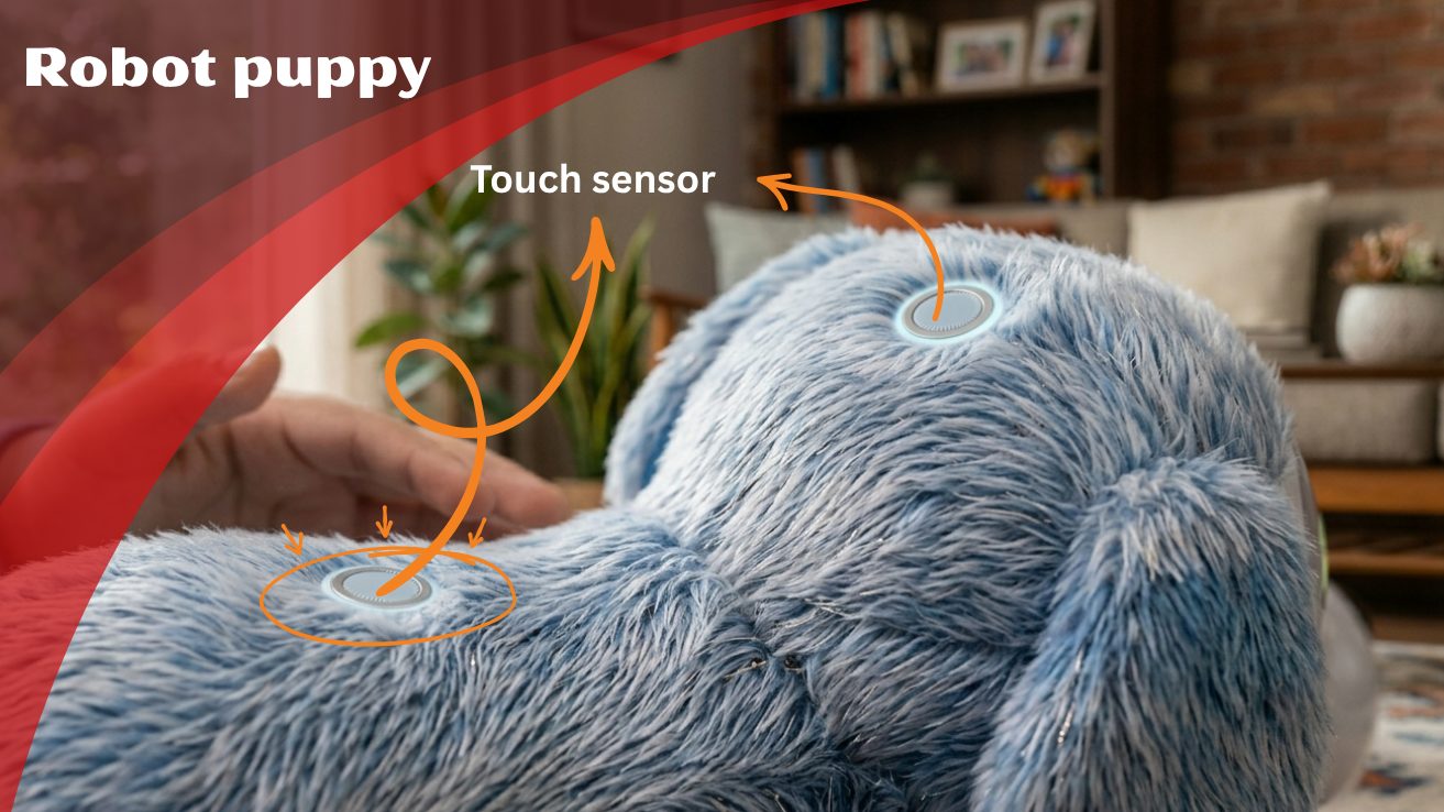 A high-end robot puppy works using touch sensors and voice recognition software, making it responsive to petting and basic commands.